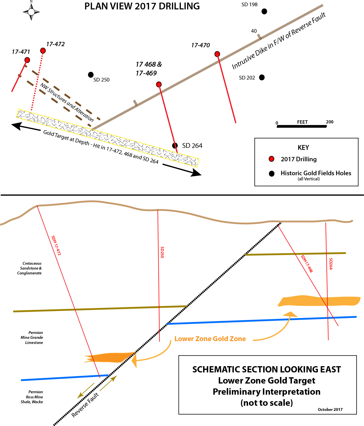 The programme was intended to test for new styles of mineralization in the district, centered upon high gold and silver intervals that were intersected in SD-264 and SDH17-468. Now a third hole, SDH17-472, has also intersected highly anomalous gold mineralization approximately 700 feet to the west-northwest. Again, it is spatially associated with highly brecciated and altered lower Mina Grande limestone, iron mineralization and intrusive dykes.